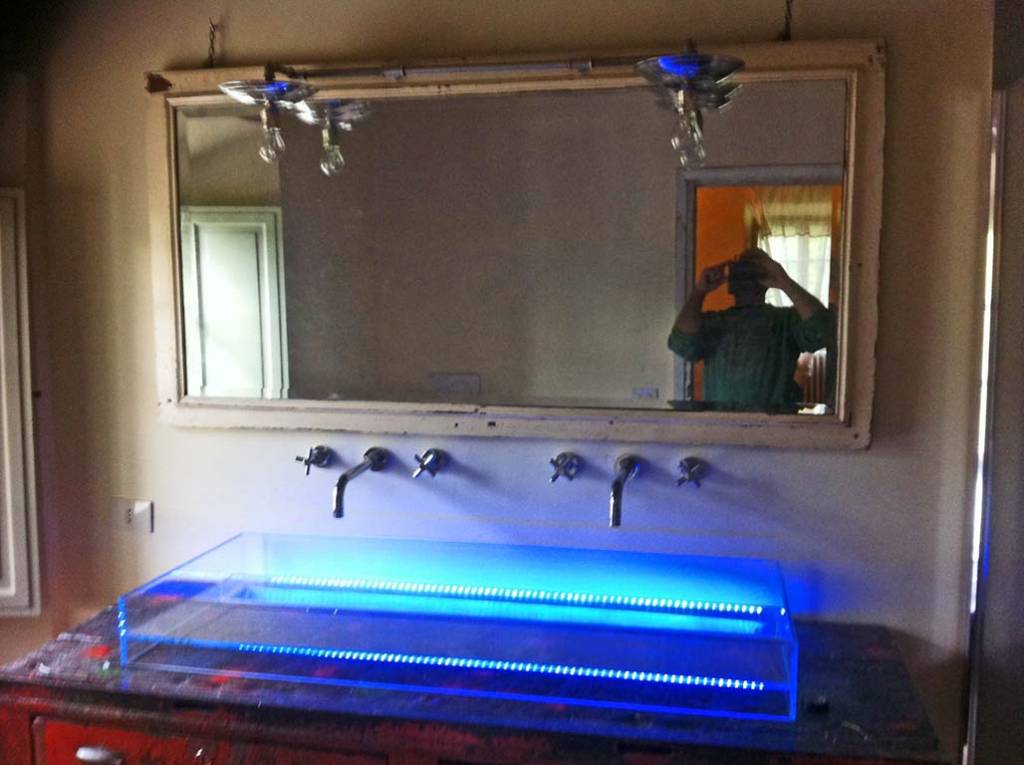 Quando si è trattato di disegnare il lavabo, abbiamo deciso per uno scarico a piano inclinato cosicché l’acqua, creando una cascatella, confluisce nella vaschetta di raccolta in acciaio(progettata da noi). Da qui defluisce normalmente nello scarico. Dietro una piccola fessura, è posta una striscia led di colore blu che illumina l’acqua creando un particolare effetto ottico .