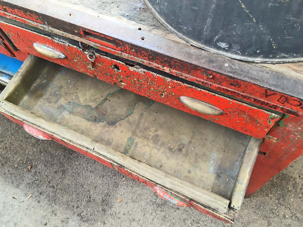 Al posto dei cassetti, poco profondi per essere utilizzati in un bagno, abbiamo optato per tenere i frontali ma togliendo tutto il resto. Si sono venuti a creare due scomparti abbastanza ampi da contenere gli oggetti. L’interno è stato rivestito in vecchia lamiera zincata. Nel piano è stata ricavata l’apertura per l’incasso della vaschetta del recupero delle acque reflue.