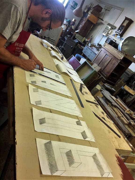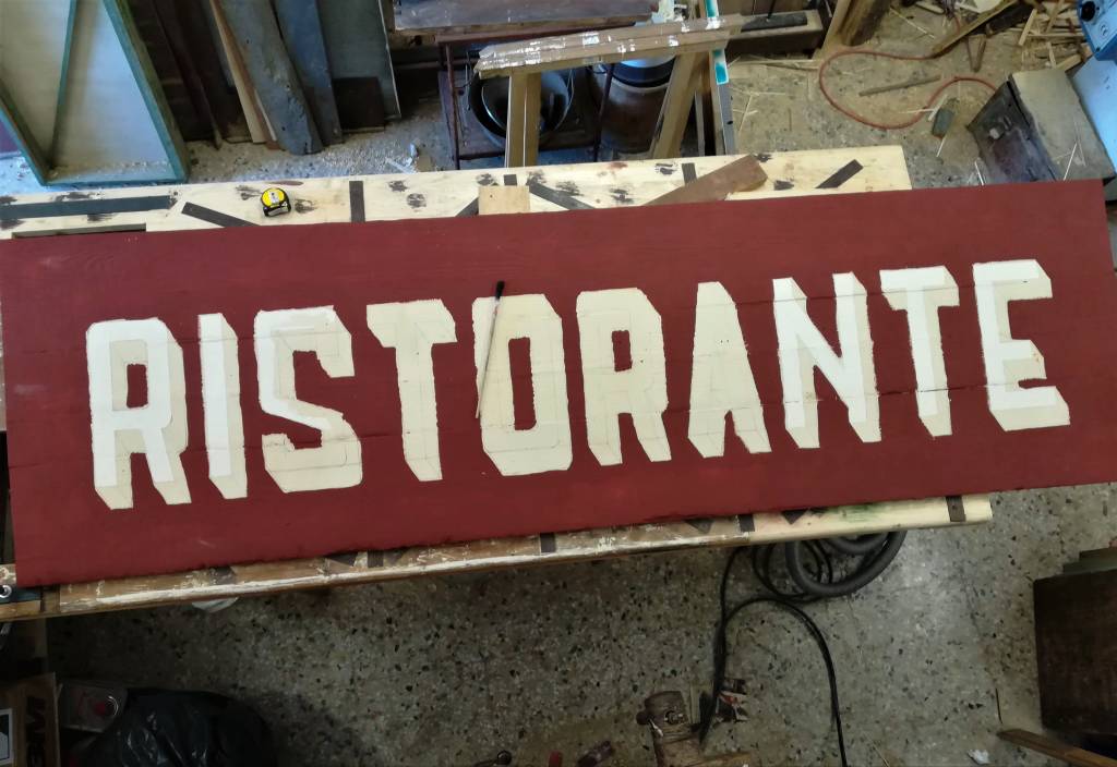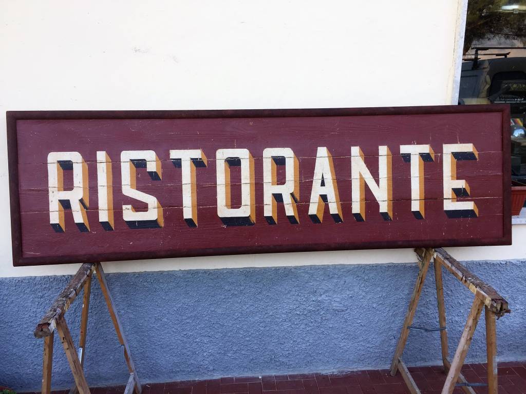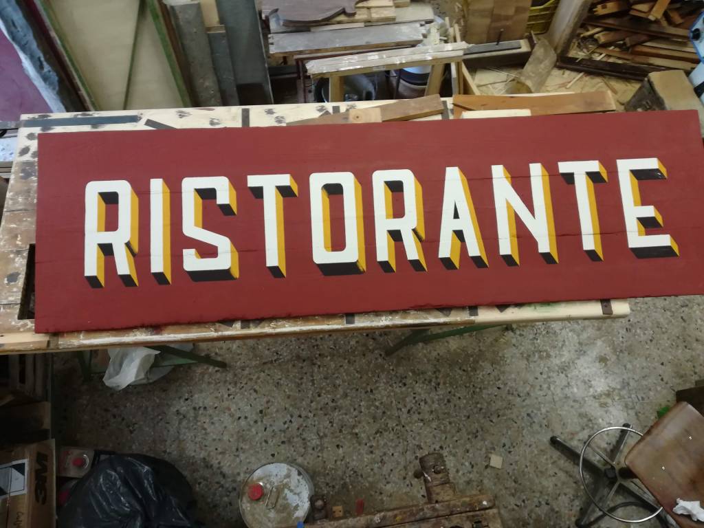 L’insegna merita una menzione particolare, abbiamo optato per dei caratteri anni ’30 che una volta disegnati su carta, sono stati trasferiti su un vecchio pannello di legno già trattato con il colore di fondo, il resto è tecnica pittorica con colori da noi preparati in bottega con pigmenti naturali. Anche in questo progetto ci siamo avvalsi della collaborazione del nostro fabbro di fiducia, il quale su nostro disegno ha realizzato le parti in metallo.