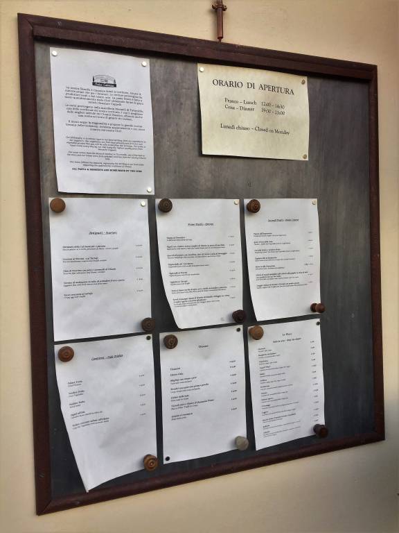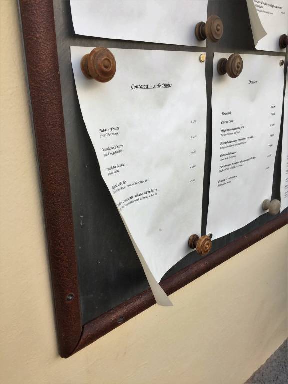 La bacheca per esporre il menù è nata dal ricordo dei vecchi pannelli per affissioni pubbliche, sulla quale è stata inserita una striscia a led per l’illuminazione. La lamiera su cui i fogli vengono attaccati mediante calamite è stata preventivamente zincata e trattata per l’invecchiamento.