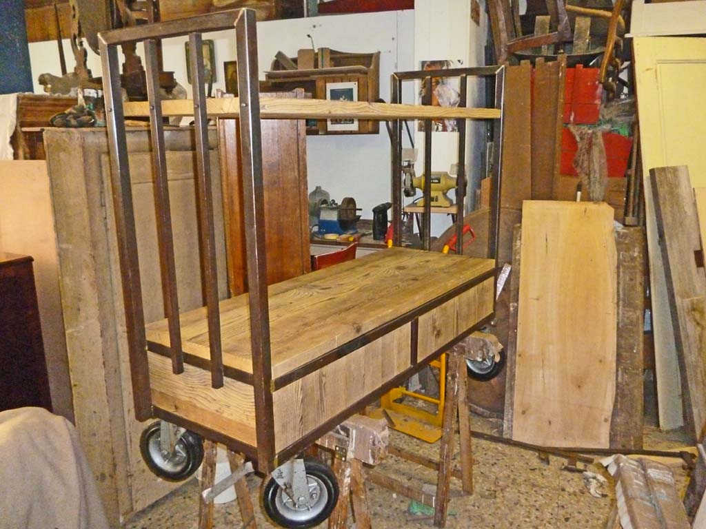 Carrello in ferro tubolare sezione quadrata con saldature in ottone proveniente da una vecchia falegnameria degli anni 40-50.