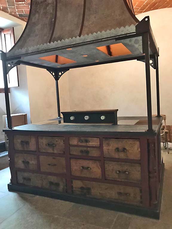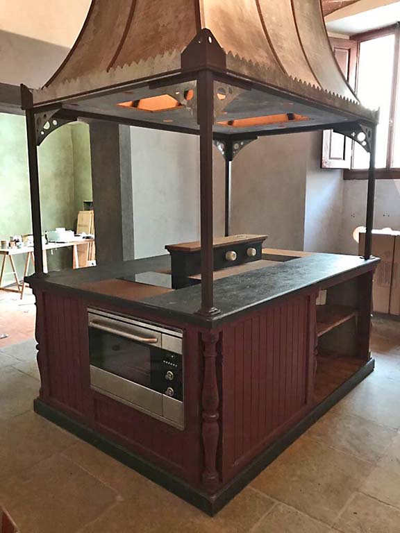 For this project (placed in a cooking school in Panzano in Chianti), we started from an old shop chest of drawers. The structure of the chest of drawers has been totally safeguarded, restoring it. We had columns of an old balustrade that were placed at the corners to create the largest structure in which to house appliances: two induction hobs and an oven. The part opposite the chest of drawers, is set up with a large compartment and a shelf, so as to have a space used as a pantry. The plan is made of colored OSB with a manganese tone. There are inserted elements in old sheet metal in the central part and on the small lift which, in addition to having a decorative function, holds the sockets for various tools. The hood is made of iron and zinc sheet.