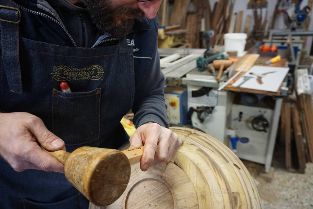 Two are made with old barrel wood; layers upon layers like overlapping geological eras then rounded by hand. This material is a direct reference to the wine history that is the protagonist in these places. Before being a tavern, the building that houses them was a cellar. The molten metal that drips from above and forms a dripping pond symbolizes the water which, together with the work of man and the earth (the sphere) nourishes and grows the vine, a symbol of Chianti and the driving force of a large part of these places.