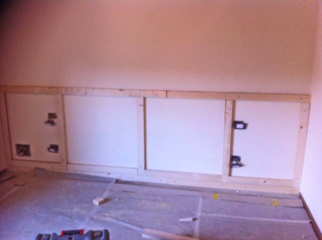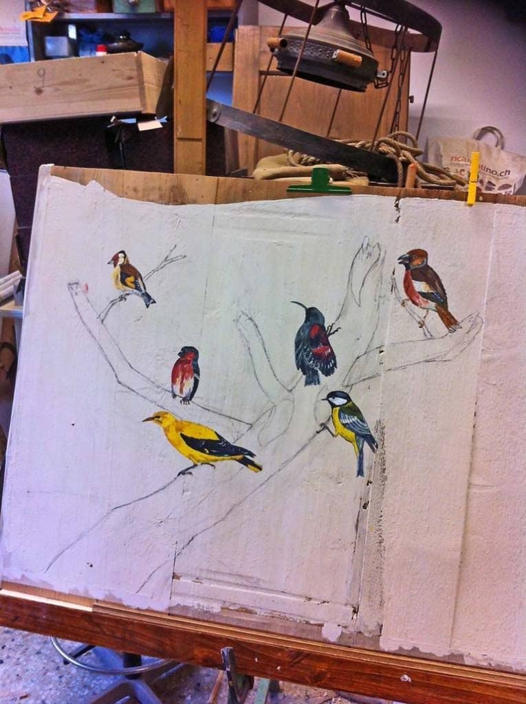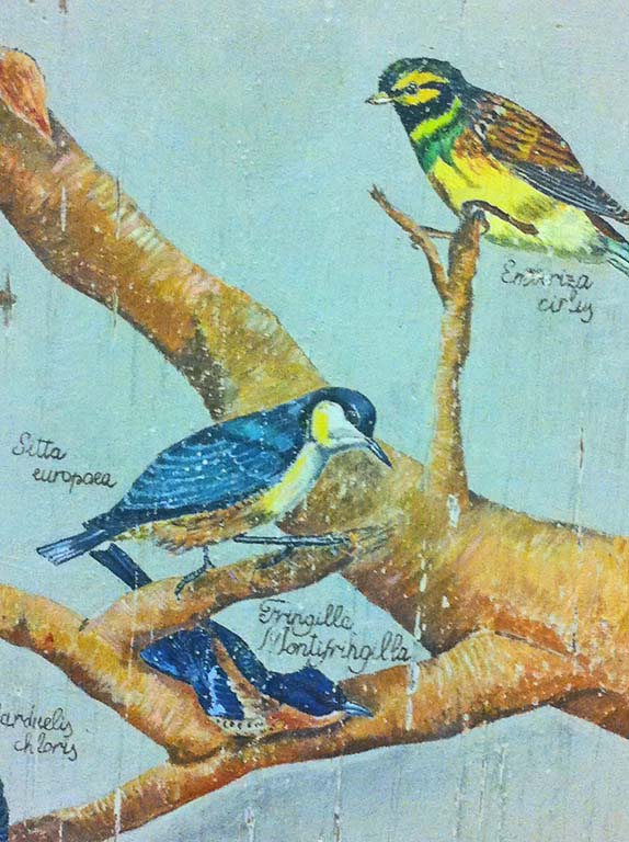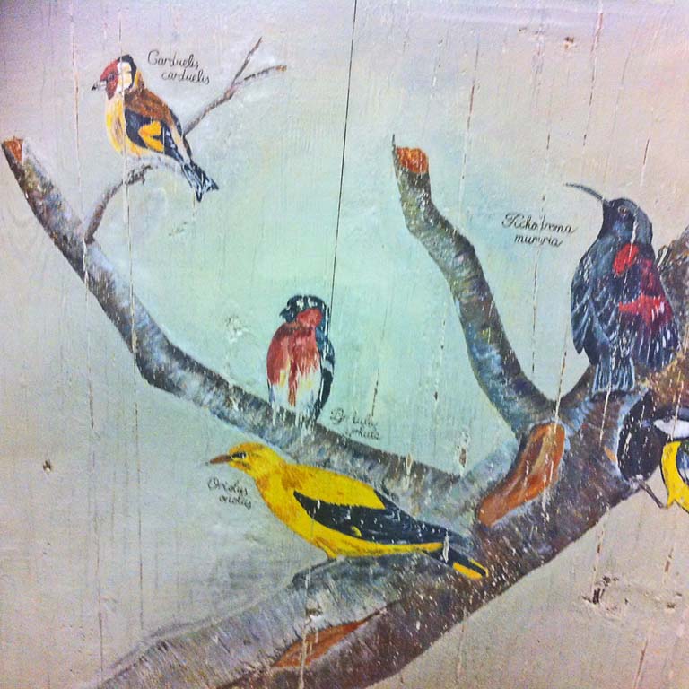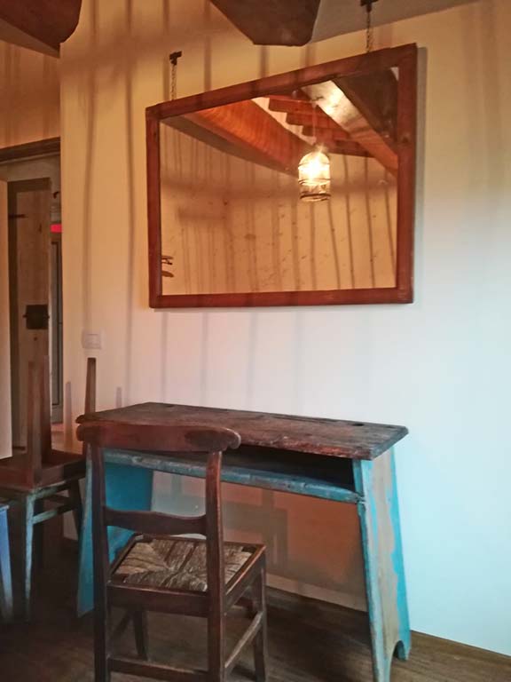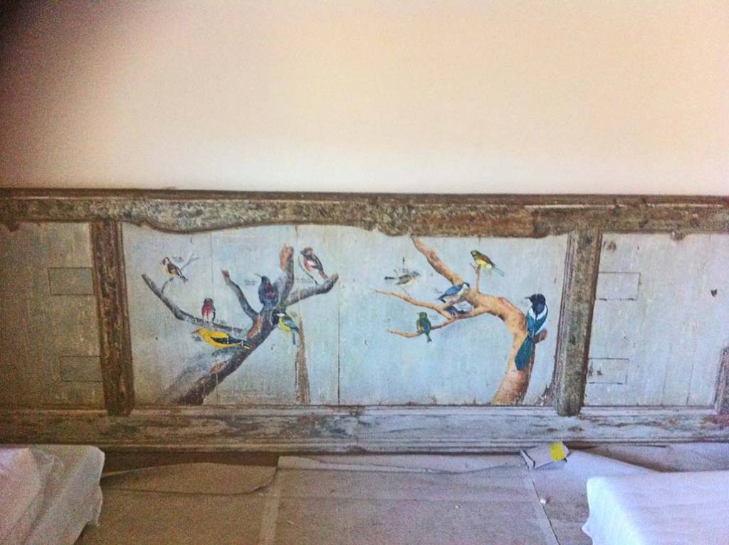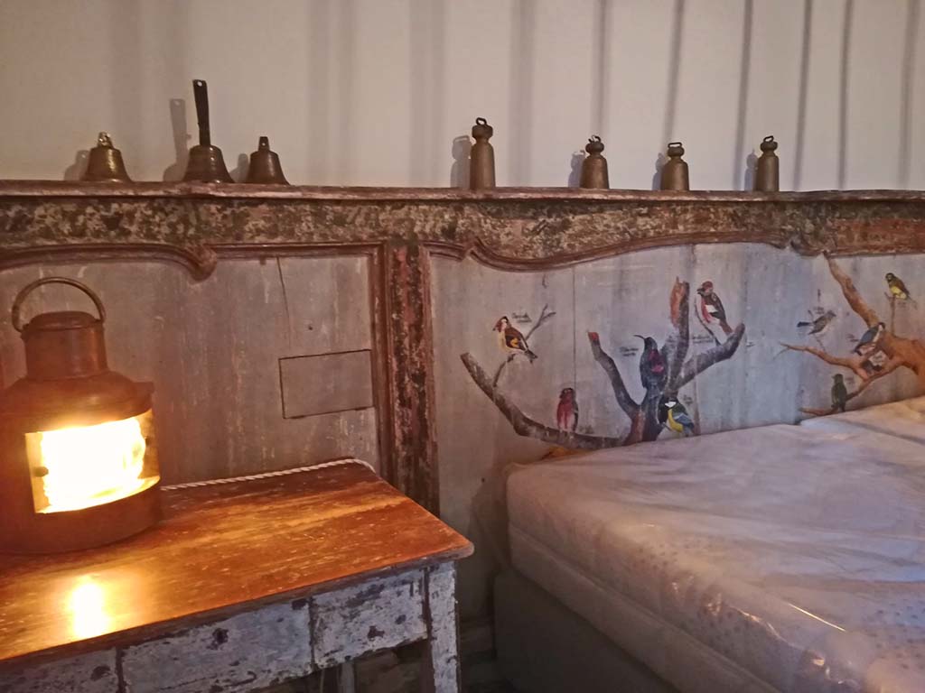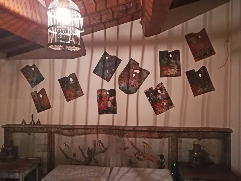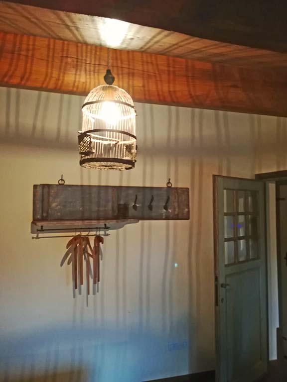 This interior environment, created for the Vicolabate agriturism, had to have a double function: to be a double room and a room with two single beds or sofas. Then room and sitting area. The transformation had to take place without disassembling, removing or adding anything to the room. Every piece of furniture had to have the possibility of being moved inside the room to transform it into a bedroom or a small living room. Hence the idea of creating a boiserie that was also a headboard. The entire structure is made of 18th century material from ancient villa portals, hence the asymmetrical peculiarity. The central panel is decorated with little birds motifs living in the Chianti area. The switches are retractable. The chandelier consists of an ancient cage made of colored iron wire. What serves as a coat rack is made from an old lacquered scurino. The ancient desk comes from an old school in our area.