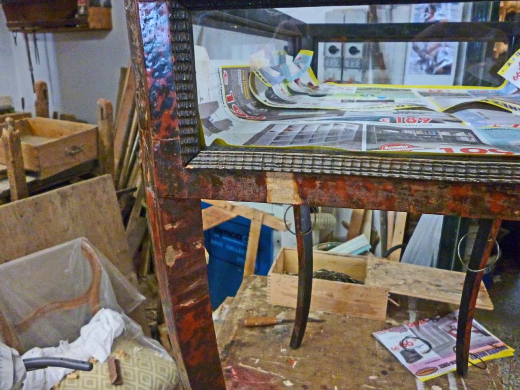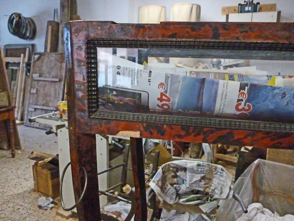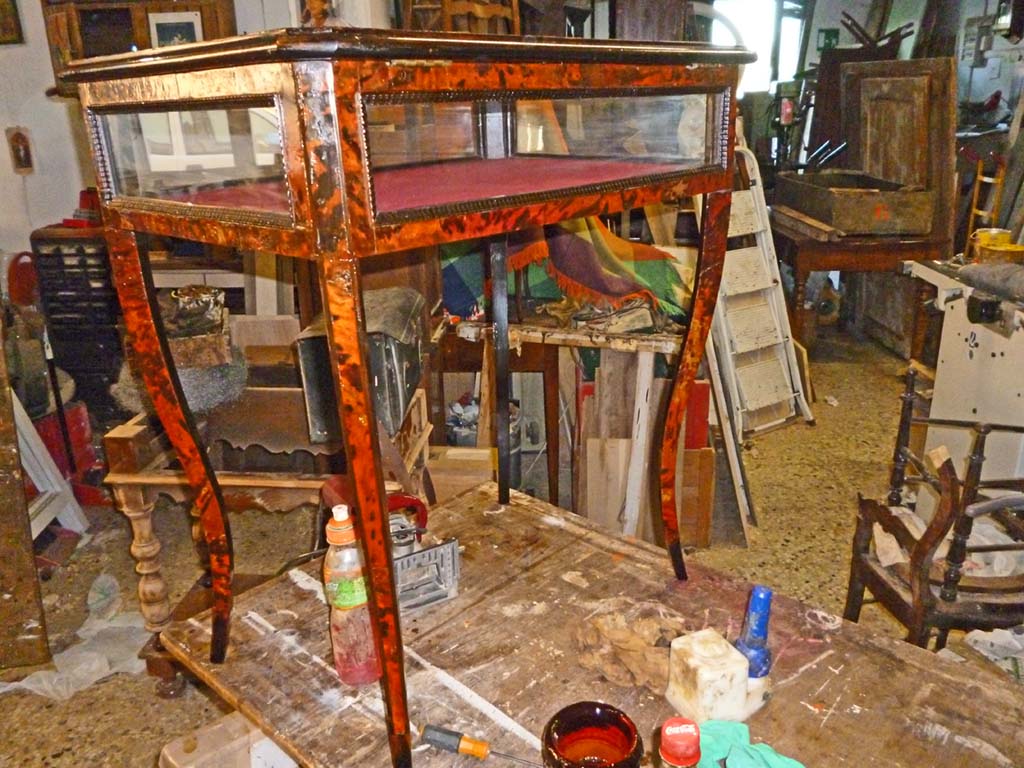 The general conditions were not bad. Wear damage usual: in the ends of the legs and in some places under the crossbar and on the lid. The biggest problem was the not easy availability of the turtle. To overcome this, the reconstructions of the missing parts were made with araldite. With the colors the typical veins of this very particular material have been recreated. The piece of furniture was then finished with a pad.