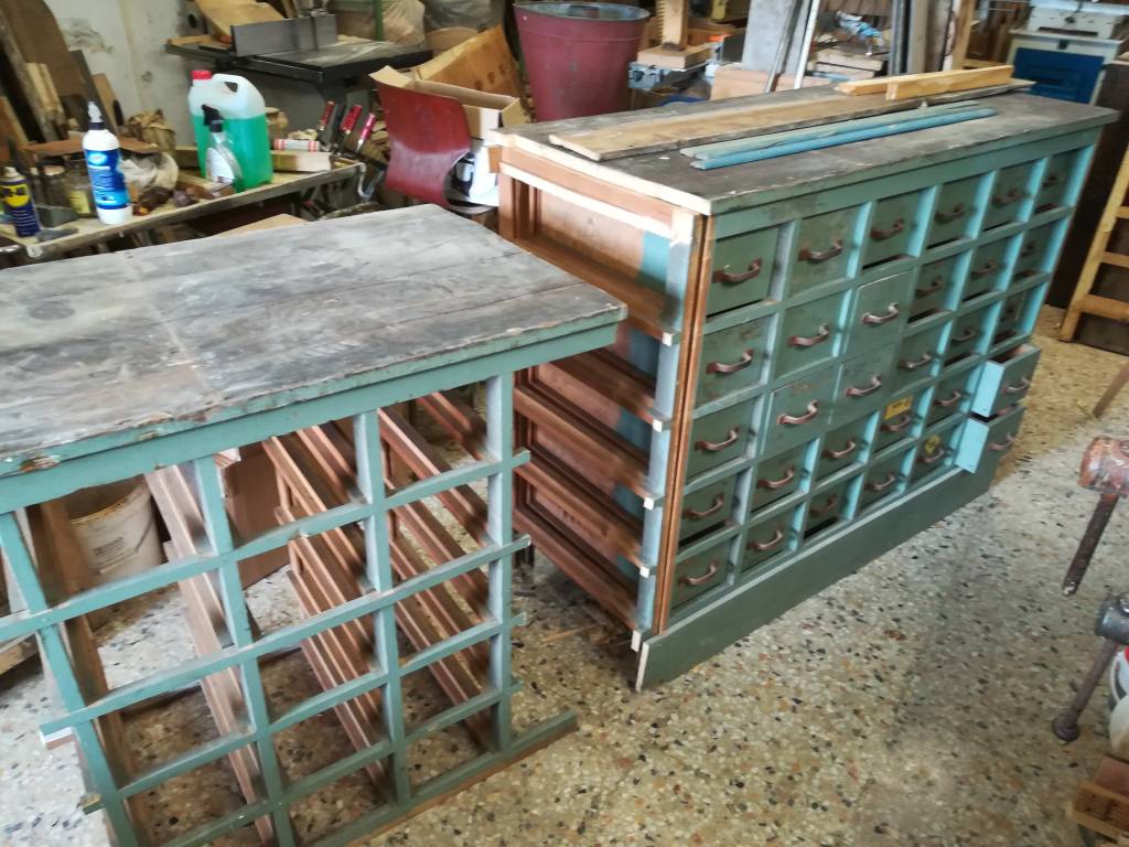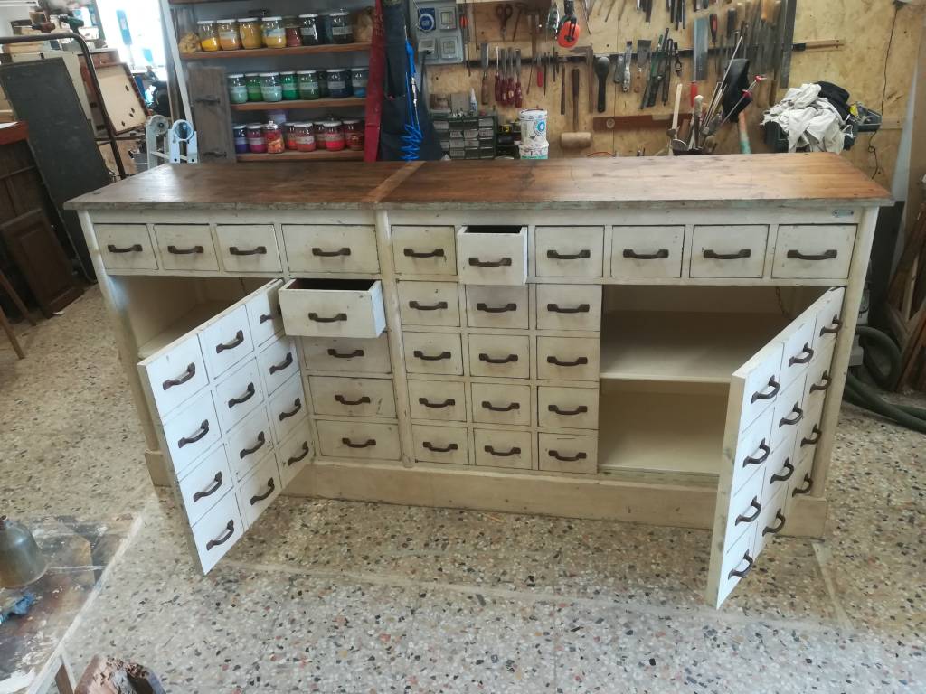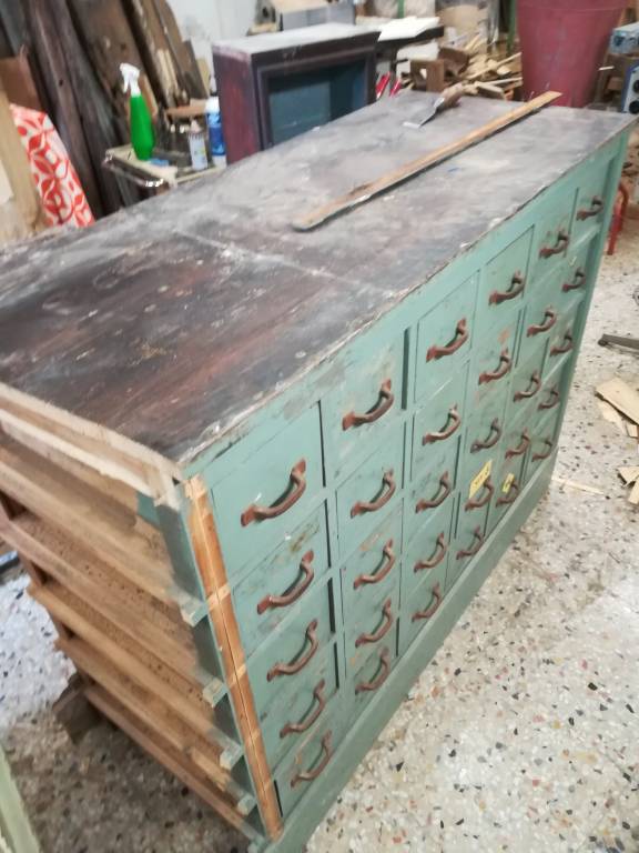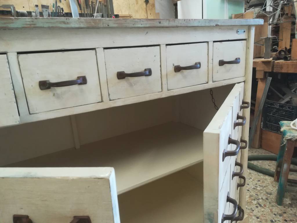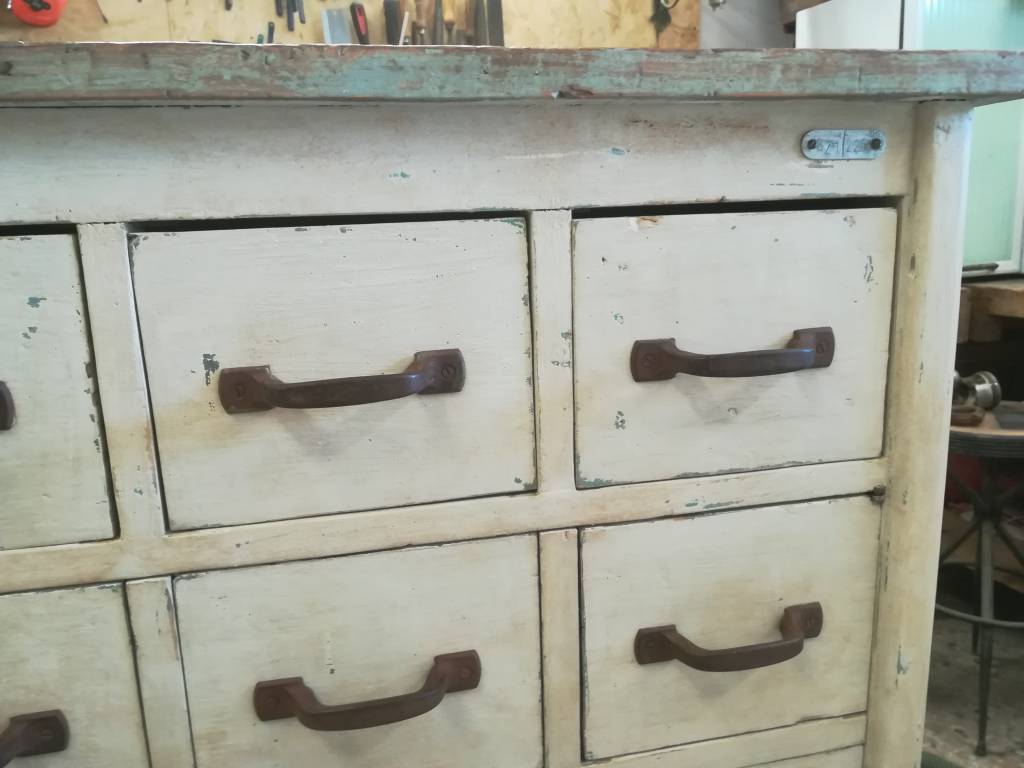What you are looking at is the result of a bailout. When they called us to view some industrial drawers to buy, we found ourselves facing a half disaster. Those who had contacted us had seen fit to free them by cutting them with the chainsaw and also giving them some nice blows. But we were not impressed by furniture saviors. Once purchased, (in total there are more than seven meters of drawers), a part immediately ended up in the shop to be transformed. In this case, the customer needed a long and capacious sideboard but that was not the usual belief. Thus this kitchen cupboard – drawers was born. All the low structures have been removed to create the internal spaces. Some drawers have been saved for classic use. The drawer fronts and the respective frames were put together to create the doors. New interiors, new color, original handles; that’s how GIAKKEMIKKE turns a scrap into unique piece!