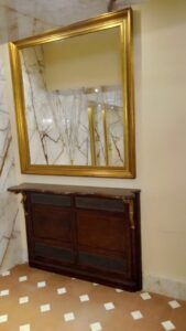 Nel caso che vedi in foto, il risultato è un elemento elegante, con lavorazioni classiche e dettagli dorati che dialogano con lo specchio e il contesto architettonico.