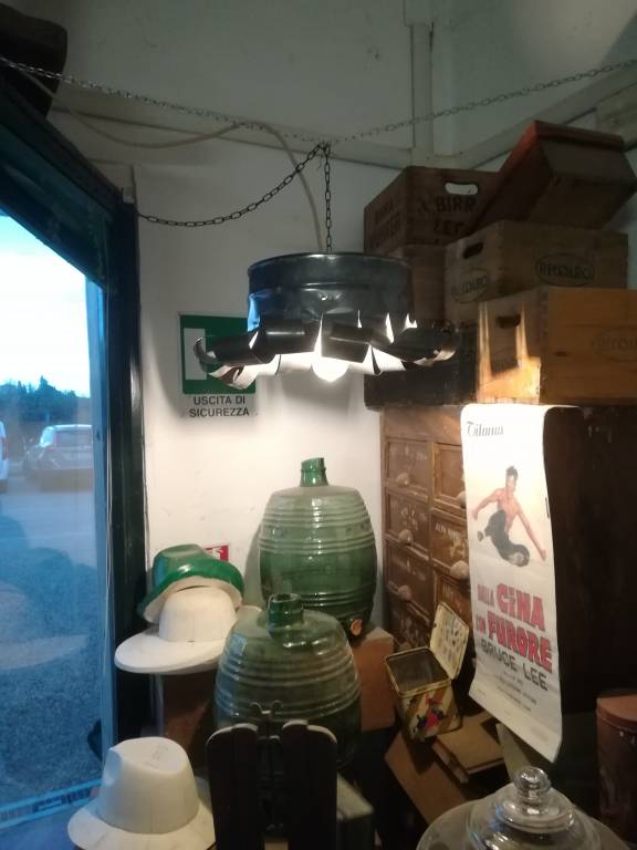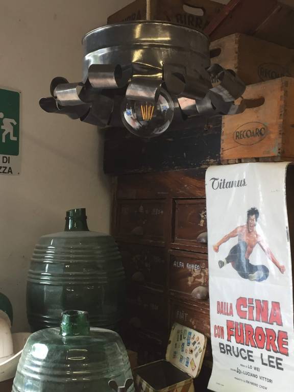 Da noi il riuso è alla base di tutto. Questo lampadario è nato quando il bidone di pulitore che usiamo nei restauri si è esaurito. Invece di buttarlo ci abbiamo creato un punto luce. E’ il primo esemplare ma ne possiamo realizzare altri su ordinazione.