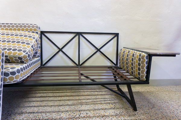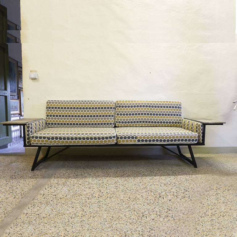 Questo divano non è solo un semplice pezzo di arredamento; è un’opera d’arte che celebra l’unione di materiali e stili. Il telaio, realizzato in tubolare di acciaio verniciato interamente a mano, conferisce al pezzo una robustezza e una resistenza senza pari, mentre i ripiani porta oggetti, creati con cura da legno di recupero, aggiungono autenticità all’ambiente.