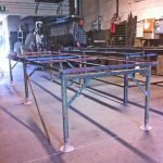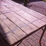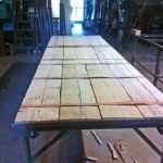 La struttura delle gambe, come detto, è formata da tre vecchie acca da ponteggio ormai inservibili per i cantieri data la vetustà dei pezzi. A queste, sono state aggiunte le traverse in ferro poste al di sotto del piano per ricreare la fascia che si trova normalmente nei tavoli. Il telaio nel quale è inserito il piano ( misura 410 x 120 cm), proviene da vecchie scaffalature di un gommaio, recuperate. Per il piano, abbiamo utilizzato vecchissimi tavoloni da ponteggio per restare in tema( alcune larghe più di 60 cm). Per unire il tutto, abbiamo messo strisce di lamiera zincata di antiche grondaie. Il legno è stato spazzolato e incerato.