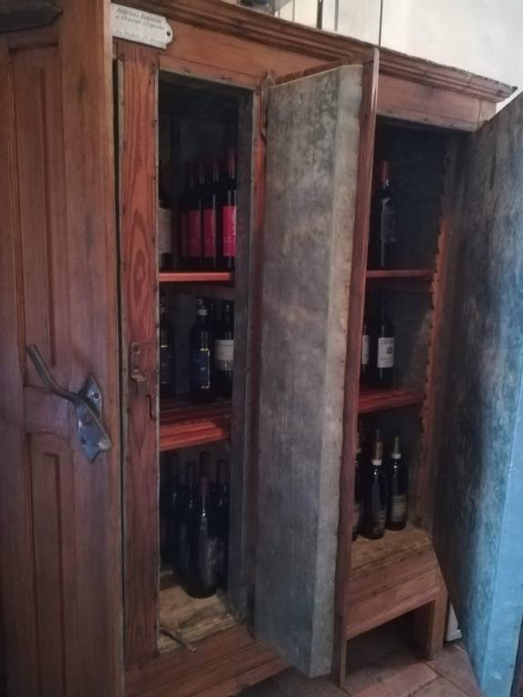 Il lavoro è consistito nel pulire l’esterno e l’interno, rivestito di lamiera di zinco, per portarlo ad un livello di pulizia e igiene atto a conservare del vino. Anche il radiatore è stato pulito( inserite all’interno ci sono ancora le vaschette per i cubetti di ghiaccio). Le condizioni generali non erano pessime a parte alcune mancanze nella cornice bassa e infiltrazioni di acqua nelle zampe che avevano indebolito la struttura del legno. Dopo il consolidamento anche del tetto, siamo passati a togliere la vecchia vernice che ha rivelato un bel larice compatto. Sono stati realizzati dei ripiani simili a quelli che ci potevano essere stati in origine, sempre in larice.