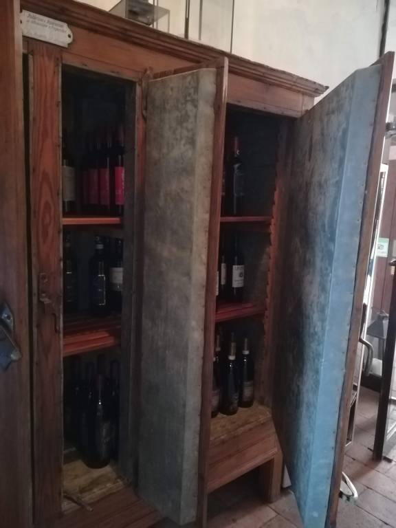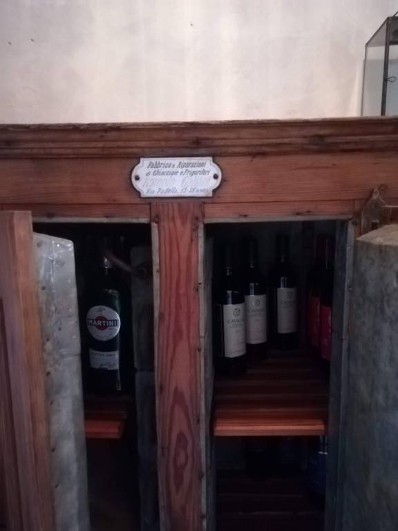 Questo lavoro per un ristorante di Montefioralle, ci ha “stuzzicato l’appetito”. Si trattava di ripulire, da decenni di sporcizia e ossidazioni varie, questo bel mobile ghiacciaia. Nato per mantenere i cibi in fresco col ghiaccio, era stato modificato in frigorifero probabilmente negli ultimi anni cinquanta. Si notano i fili e gli interruttori messi successivamente la realizzazione del mobile. Sopra era collocato il compressore. Quasi sicuramente era usato in una macelleria o negozio affine. Una volta,nelle abitazioni, chi se la poteva permettere, ne possedeva di più piccoli e non c’erano molti cibi da conservare in frigo come oggigiorno. All’interno, era posto il radiatore refrigerante; un pezzo di archeologia industriale che da solo avrebbe arredato una stanza. Introvabile! Il cliente voleva mantenere proprio questo carattere originale, comprese le modifiche accorse negli anni. Naturalmente l’uso odierno non è più di frigo ma di espositore di vino.
