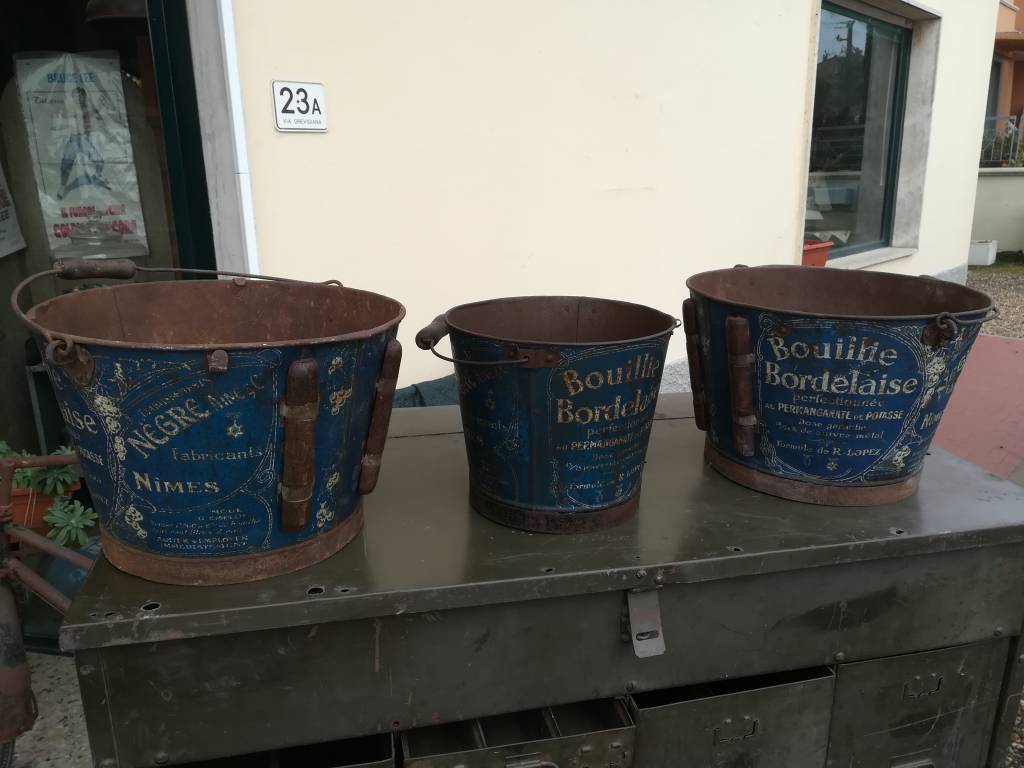 Bellissimi secchi francesi in metallo e legno con colore originale, probabilmente usati in agricoltura intorno ai primi del 900.